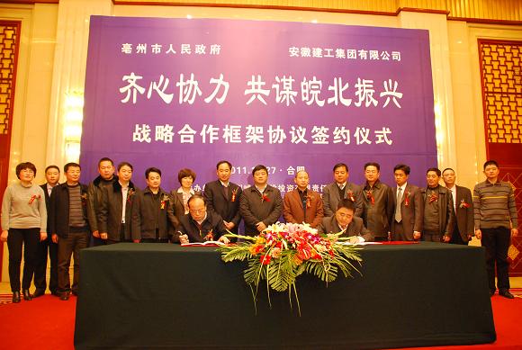 胡運成董事長在致辭中指出,隨著工業(yè)化進程的顯著加快和城市化水平的快速提升,亳州市勞動力資源豐富和投資環(huán)境優(yōu)良的優(yōu)勢日益凸顯,加之省委、省政府密集出臺支持皖北地區(qū)發(fā)展的一系列政策措施,亳州必將迎來新的黃金發(fā)展機遇期。亳州市的加快發(fā)展對市場建設(shè)規(guī)模、建筑業(yè)管理水平和專業(yè)技術(shù)人才提出了更高的要求。在當前“和諧發(fā)展、全面轉(zhuǎn)型、加速崛起、興皖富民”的大背景和省委、省政府大力支持皖北地區(qū)經(jīng)濟發(fā)展的良好機遇下,安徽建工正在致力于實現(xiàn)“安徽建筑的創(chuàng)新服務(wù)領(lǐng)導(dǎo)者”的戰(zhàn)略愿景。同時,安徽建工擁有雄厚的資本、成熟的項目管理和工程施工經(jīng)驗以及大批優(yōu)秀的專業(yè)技術(shù)人員,在業(yè)內(nèi)具有優(yōu)質(zhì)的品牌和顯著的業(yè)績。因此,雙方的互補優(yōu)勢明顯,合作前景廣闊。安徽建工與亳州市政府建立戰(zhàn)略合作關(guān)系,既是亳州市委、市政府對安徽建工的信任,也是安徽建工支持亳州市建筑業(yè)義不容辭的責任。這對于發(fā)揮省屬大型骨干建筑企業(yè)的帶動力和輻射力,提升亳州建筑業(yè)發(fā)展水平,促進經(jīng)濟社會實現(xiàn)率先突破發(fā)展具有重大意義。