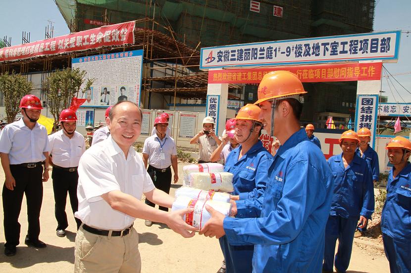 7月24日上午, 安徽建工集團(tuán)總經(jīng)理、副董事長(zhǎng)、黨委副書(shū)記趙時(shí)運(yùn),在紀(jì)委書(shū)記、工會(huì)主席牛曙東及省三建公司黨委書(shū)記徐曉光、副總經(jīng)理左登宏等陪同下,冒著酷暑來(lái)到該公司投資開(kāi)發(fā)的全椒縣麗陽(yáng)蘭庭房地產(chǎn)項(xiàng)目部,親切慰問(wèn)奮戰(zhàn)在一線(xiàn)員工,并給他們送去了綠豆、白糖、毛巾、人丹、風(fēng)油精等防暑降溫用品,察看了項(xiàng)目施工生產(chǎn)情況和樓盤(pán)營(yíng)銷(xiāo)情況。