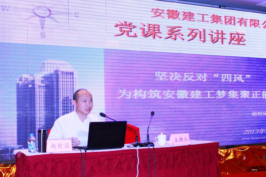 “功崇惟志,業(yè)廣惟勤?!卑不战üぜ瘓F(tuán)有限公司黨委書記、董事長(zhǎng)趙時(shí)運(yùn)于8月14日下午,來到水建總公司為中層以上管理人員及機(jī)關(guān)全體黨員、入黨積極分子近170人上了一堂題為《堅(jiān)決反對(duì)四風(fēng),為構(gòu)筑安徽建工夢(mèng)集聚正能量》的專題黨課;集團(tuán)公司黨委副書記、副董事長(zhǎng)李長(zhǎng)斌主持黨課。