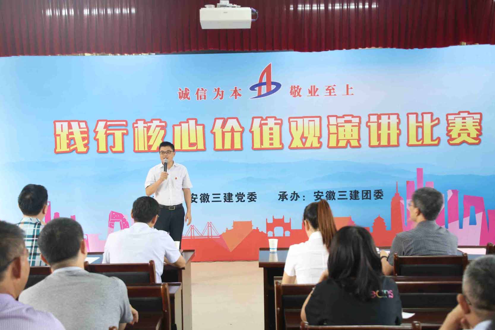 安徽三建團(tuán)委響應(yīng)黨委和上級(jí)團(tuán)委的號(hào)召,積極推進(jìn)“建工青年踐行核心價(jià)值觀”系列活動(dòng),舉辦“誠(chéng)信為本 敬業(yè)至上 踐行集團(tuán)核心價(jià)值觀”主題演講活動(dòng)。來自一線的20名青年員工參加l了演講,他們圍繞“誠(chéng)信為本 敬業(yè)至上”核心價(jià)值觀主題,結(jié)合各自工作和生活經(jīng)歷,用真摯的情感、樸實(shí)的語言、生動(dòng)的事例,聲情并茂、滿懷激情地講述了安徽三建人在實(shí)現(xiàn)“省內(nèi)領(lǐng)先、國(guó)內(nèi)一流”的宏偉愿景中,立足崗位,恪守誠(chéng)信、建功立業(yè)的深切體會(huì)和誠(chéng)實(shí)守信、愛崗敬業(yè)的感人故事;項(xiàng)目工地的“老黃?!?、克難攻堅(jiān)的“先鋒隊(duì)”、企業(yè)發(fā)展的“排頭兵”……在選手們聲情并茂的演講中,生動(dòng)再現(xiàn)了先進(jìn)模范人物堅(jiān)韌不拔、敬業(yè)奉獻(xiàn)的形象,用發(fā)生在身邊的感人事跡、工作亮點(diǎn)、工作感悟和經(jīng)驗(yàn)做法,感染了在座的每位觀眾,贏得了評(píng)委和觀眾的陣陣掌聲,讓每一位聽眾的心靈受到一次了正能量的洗禮。比賽中,選手們激情飽滿,感情真摯,從不同層面、不同角度傾情講述,生動(dòng)刻畫模范的樸實(shí)形象,展現(xiàn)身邊員工于平凡中奉獻(xiàn)青春、于艱苦中助力改革、于崗位中磨練尖兵的樸實(shí)情懷。