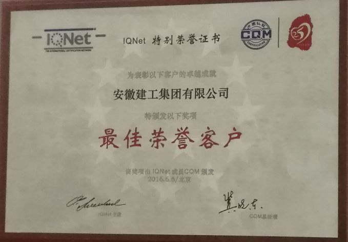 2016年12月1日,“2016年方圓標(biāo)志認(rèn)證集團(tuán)獲證客戶交流會”在合肥召開,安徽建工集團(tuán)榮獲方圓標(biāo)志認(rèn)證集團(tuán)“最佳榮譽(yù)客戶”。