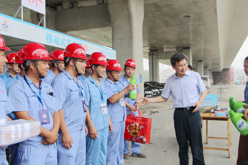 張?zhí)炫嘁恍信c項(xiàng)目部職工一一握手,關(guān)切的叮囑要注意防暑降溫、保重身體。張廳長認(rèn)真聽取了項(xiàng)目負(fù)責(zé)人關(guān)于工程施工情況的匯報(bào),實(shí)地參觀了施工現(xiàn)場設(shè)置的移動(dòng)醫(yī)務(wù)室和移動(dòng)茶水亭,仔細(xì)詢問防暑降溫各項(xiàng)保障工作,對項(xiàng)目部細(xì)致、周密、人性化的防暑降溫保障措施,給予了充分肯定。他要求項(xiàng)目部要妥善安排施工計(jì)劃,避開高溫時(shí)段,合理安排作息時(shí)間,確保廣大一線建設(shè)者人身安全和健康。