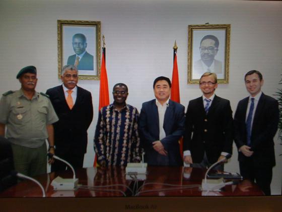 11月21日,中國(guó)駐安哥拉大使張伯倫先生設(shè)宴宴請(qǐng)了考察團(tuán)一行。胡董事長(zhǎng)一行還分別與在安哥拉合作的三家公司進(jìn)行了業(yè)務(wù)洽談,并先后與JHS公司以及Solida投資公司簽訂了3900萬(wàn)美元的承包工程合同