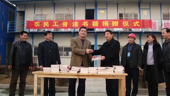 2010年元月28日下午,合肥市人民檢察院向安徽建工農(nóng)民工業(yè)余學(xué)校捐贈(zèng)農(nóng)民工普法書(shū)籍儀式在安徽三建美亞光電項(xiàng)目部舉行。市檢察院黨組成員、副檢察長(zhǎng)黃世斌,黨組成員、政治部主任童興芝等一行四人,看望慰問(wèn)農(nóng)民工兄弟,宣傳農(nóng)民工法律維權(quán)知識(shí),并現(xiàn)場(chǎng)捐贈(zèng)《農(nóng)民工普法讀本》200本。集團(tuán)公司副總經(jīng)理、集團(tuán)農(nóng)民工業(yè)余學(xué)校常務(wù)副校長(zhǎng)王禮義,集團(tuán)人力資源部主任胡建英,安徽三建紀(jì)委書(shū)記周湃等出席捐贈(zèng)儀式。